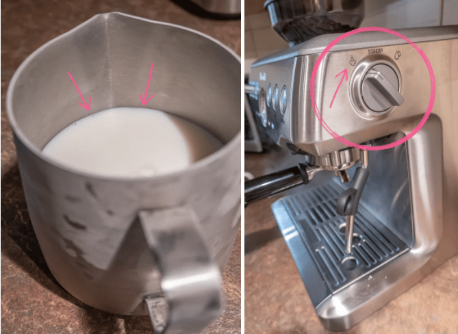 13. For lattes or cappuccinos, the next is to steam and froth the milk. Fill the milk jug to the bottom of the ‘V’ shape.